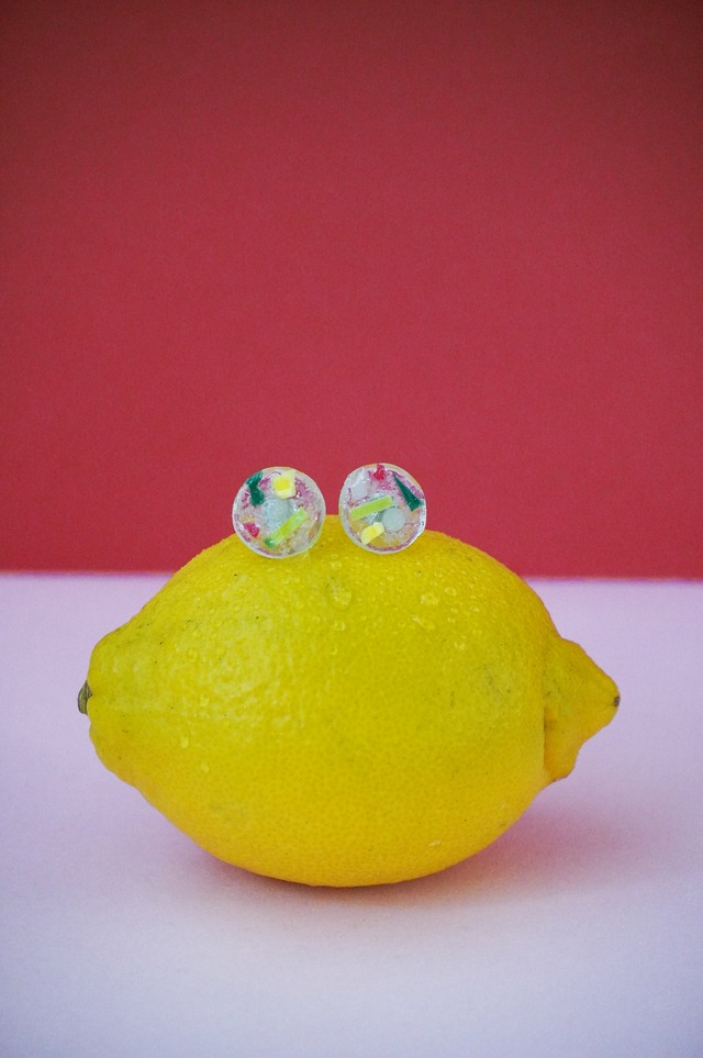 GROCERY PAPER PRODUCTS × WIN_WIN_WIN COLLABORATED PRODUCTS RELEASE! 「架空のグロサリーショップに並ぶ品々」をコンセプトにしたオリジナルプロダクトブランド グロサリーペーパープロダクツが、海洋プラスチックを素材にしたアクセサリーブランド ウィンウィンウィンとコラボレーションしたプロダクト。 今回は、海洋プラスチックを素材にしたアクセサリー ブローチ、リング、イヤリングそれぞれデザイン違いの6種類を作りました。 ウィンウィンウィンの瀬戸美穂さんが、 宮城の海辺から拾った海洋プラスチックを綺麗に手洗いし、 それぞれのテーマに合わせて素材を組み合わせたすべて1点ものです。 まるでグロサリーショップに並ぶお惣菜やお菓子のように 食べられそうなアクセサリーに仕上げていただきました。 海には、年間800万トン以上のプラスチックゴミが流れ込み、 海の生き物だけではなく、巡りめぐって私たちの体にも影響を及ぼしていきます。 これから先も、海の恵みをいただくことができるように。 いつか、このアクセサリーをつくる素材が無くなるように。 アクセサリーに、楽しい気持ちと願いを込めました。 ・・・ “Vegetable Jelly”は、クリアなベースに、カラフルな素材と本物の海塩を散らした、 ソルトキャンディをイメージしたイヤーアクセサリー。 ピアス、透明なパーツのノンホールピアスの2タイプです。 素材:海洋プラスチック、レジン モチーフサイズ:約15mm ※一点ずつ手作りしているため、素材の色味や質感に違いがあります。 一つの味としてご理解いただき、お楽しみください。 ※紙箱に、ロゴ入りのミニカードを乗せ、カラフルな水引をかけてラッピングしてお送りします。 ロゴ入りのミニカードの色、リボンの色はランダムです。 何色が届くか、楽しみにお待ちください。